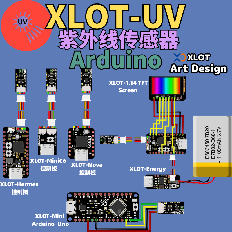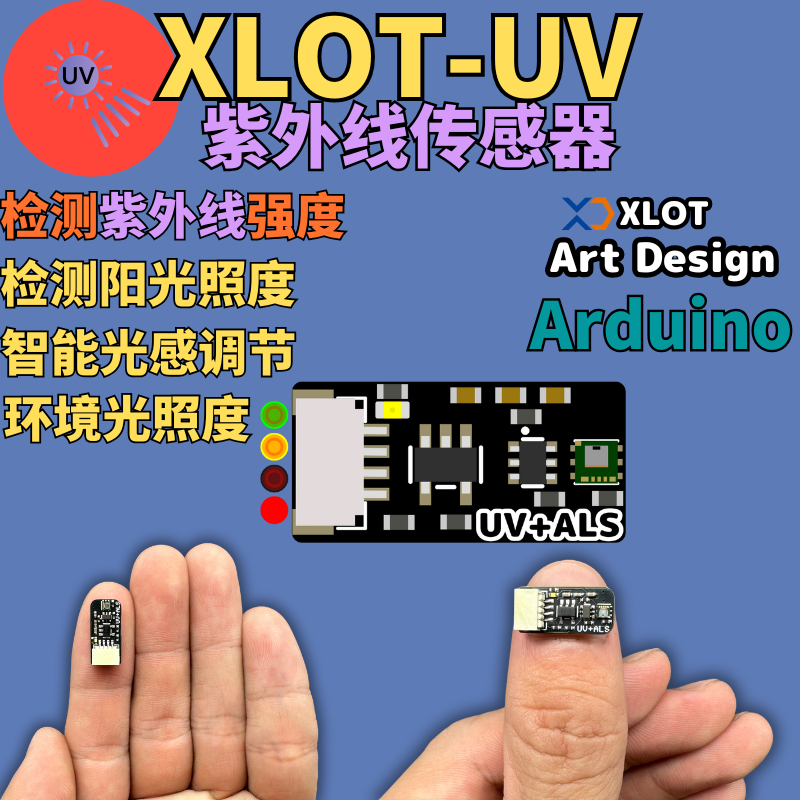 XLOT-UV Arduino 库为XLOT量身定制,支持紫外线(UV)与环境光(ALS)数据读取,兼容 Arduino、ESP32等平台。 只需几行代码,即可完成初始化与光照检测,让你的项目轻松实现环境感知与智能调光功能。