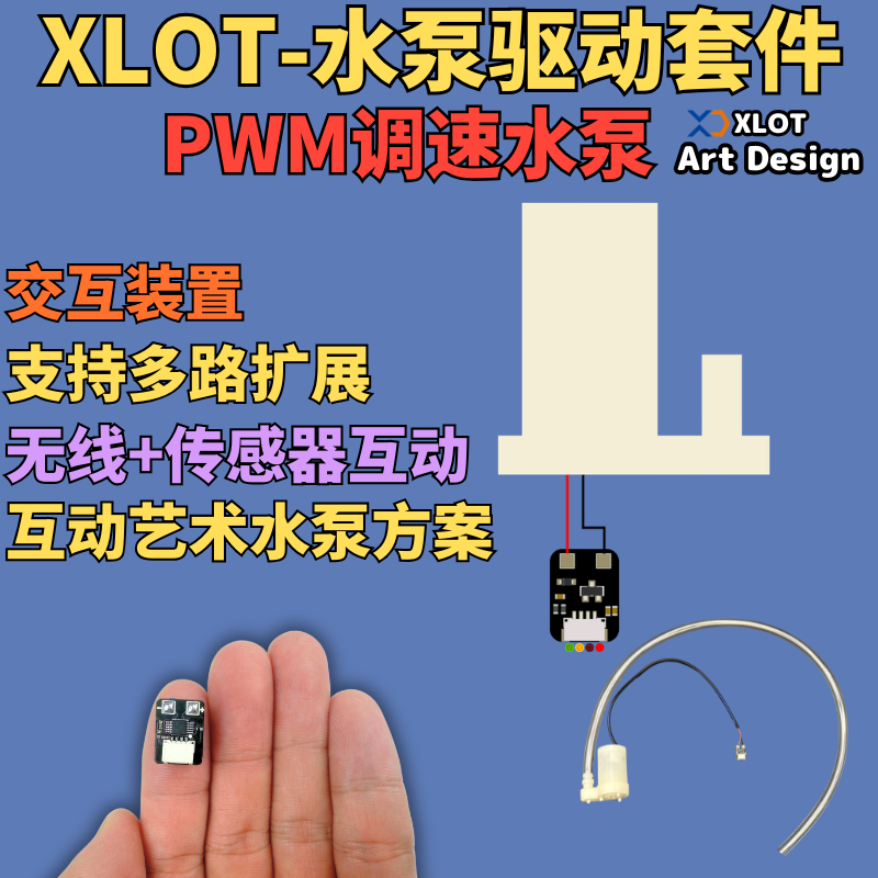 XLOT-水泵驱动套件 | XLOT Water Pump Driver Kit 是一款面向创意交互、智能控制与原型开发的小型液体驱动解决方案。套件采用 XLOT 自研 PWM 驱动电路,可对微型水泵进行稳定驱动与调速控制,让水流不只是“开/关”,而是可以被程序精细控制的动态输出。
